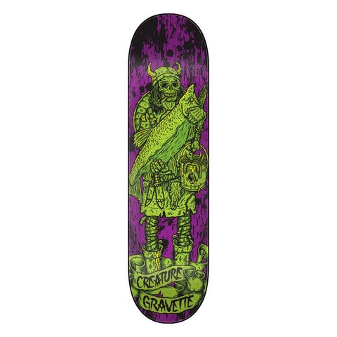 Creature David Gravette Viking of The Hesh Law XX Pro 8.3" skeitilauta on David Gravetten pro-malli Creature Skateboardsin legendaarisesta "Vikings of The Hesh Law" -sarjasta (XX-versio). Todd Bratrudin klassikkografiikka tekee paluun päivitettynä – viikinkifiend Gravetten sylissä "latest catch" (uusi saalis), purple/green-väreillä ja vahvalla hesh-viballa. Tämä 8.3" on sarjan teknisin ja ketterein malli.