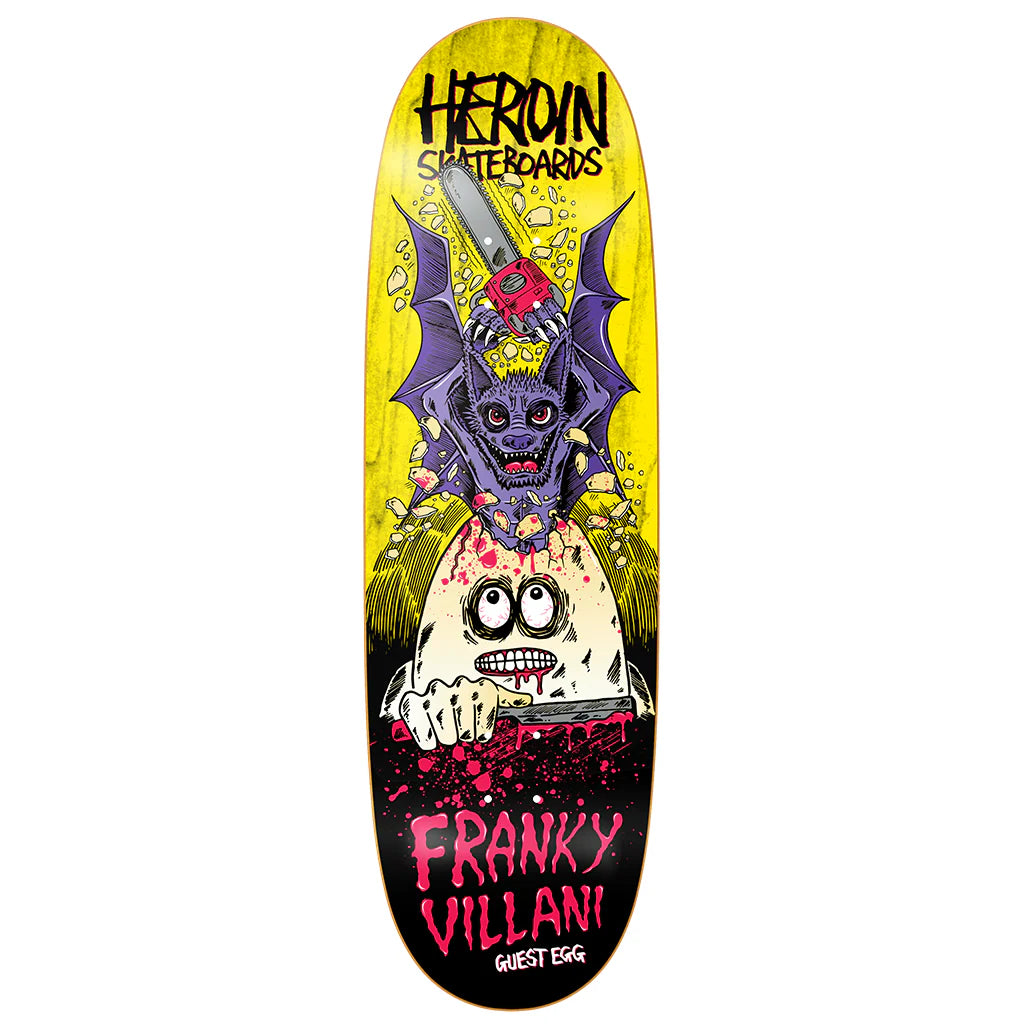 Skeittidekki Heroin Skateboards Franky Villani Guest Egg 9.5 on egg-shape -muotoinen lauta, joka tuo hieman enemmän leveyttä ja pinta-alaa perinteiseen street-dekkiin verrattuna. Pyöristetty muoto tekee laudasta vakaamman rullauksessa ja antaa jaloille enemmän tilaa erityisesti kaarissa ja alastuloissa.