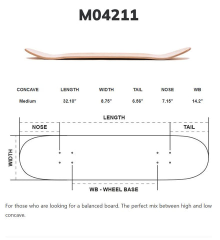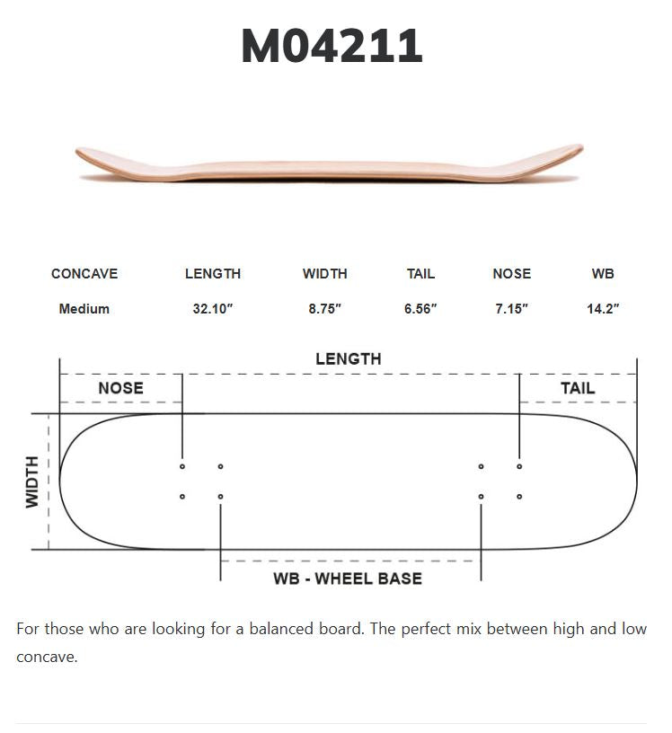 - Mitat: 8.75" x 32.10", wheelbase 14.20"